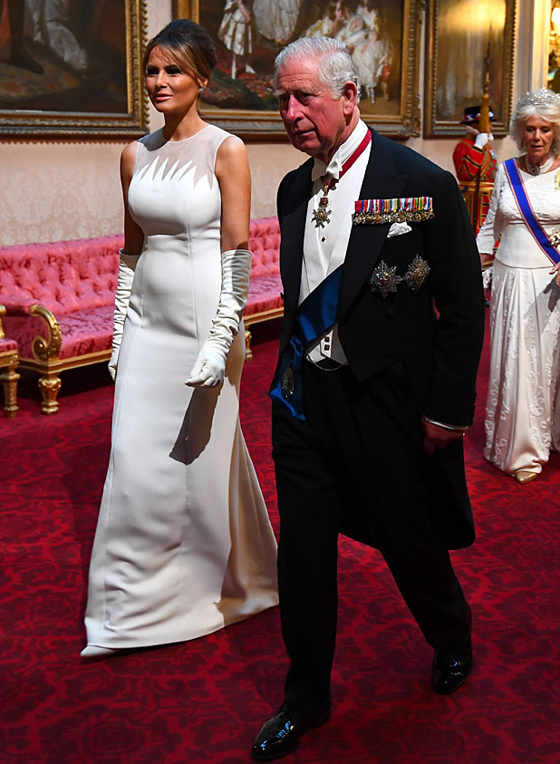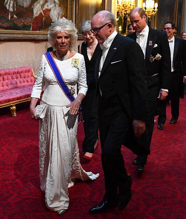 The Queen was also elegant in white. Her Angela Kelly gown featured an embroidered daisy design, topped off with a dazzling ruby necklace and tiara.