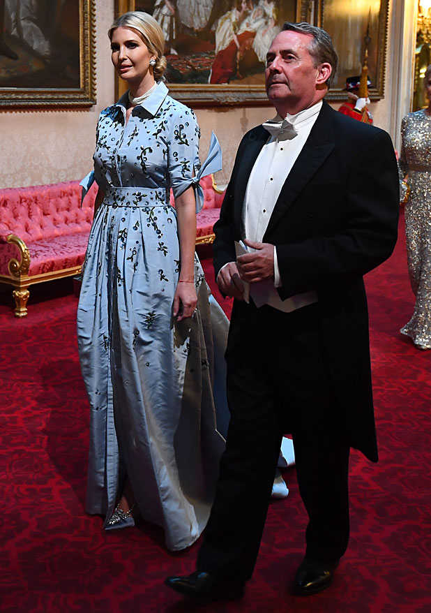As for the Trumps, Melania went with custom Dior, sporting a sleek gown and matching gloves, while Ivanka stood out in a blue sequined Carolina Herrera gown, complete with a pearl choker and earrings.