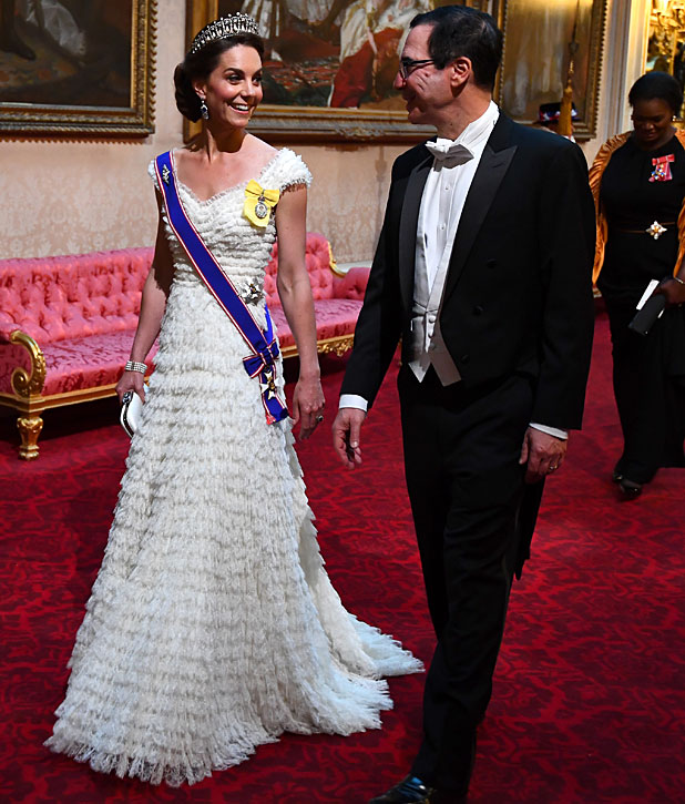 Kate went full glam for the banquet with the Trumps on Monday night (UK time), donning a floaty white Alexander McQueen gown and her go-to Lover's Knot tiara.