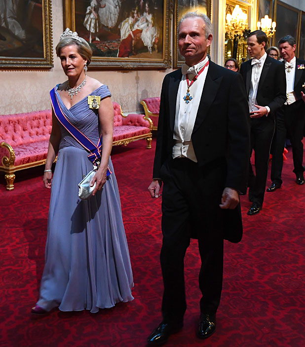 The mum of three finished off the look with the Queen mother's sapphire and diamond earrings, as well as a blue, white and red sash of the Royal Victorian Order.